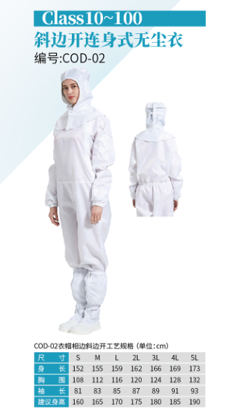 产品描述:斜边开连身式无尘衣
